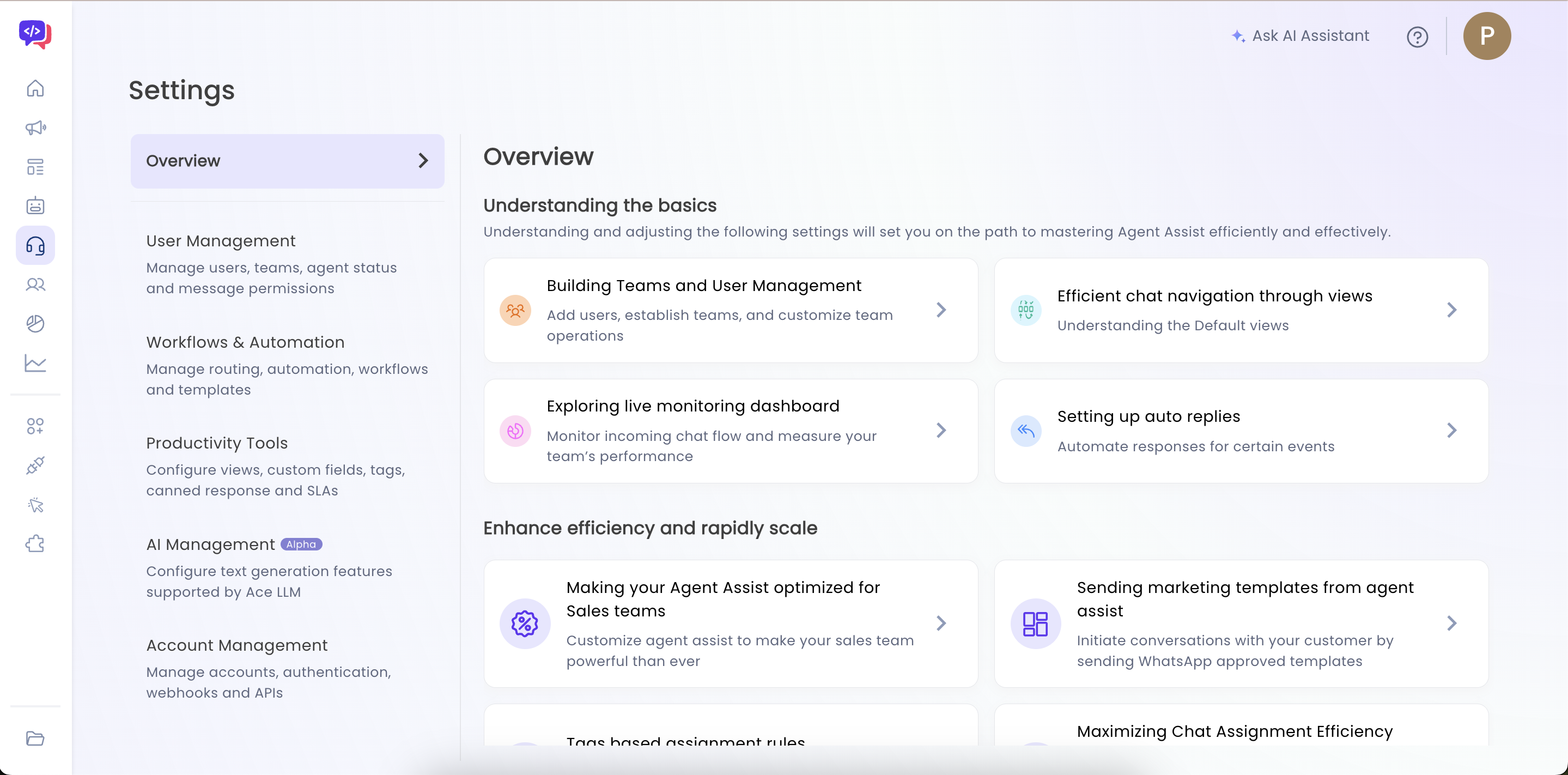 The Overview section provides a high-level introduction to the key configuration areas within Agent Assist. It helps you understand how different settings work together to shape your chat operations, team efficiency, and platform performance.